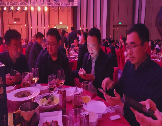 宴请开始,大家在宴请中互相走动,顾不上吃喝,餐桌上有时都空了,忙着去交流,碰酒,道贺!