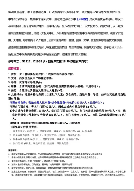 以上各旅游产品从西安的火车站出发,同时我们公司实施全国的联运,只是补一个地区动车组票差,界届时多退少补。